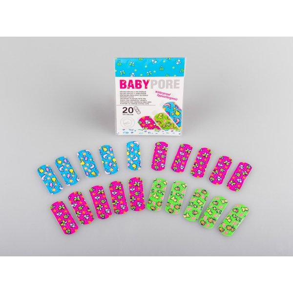 Veselé a barevné potisky na náplastích BABYPORE napomáhají rozptýlit pozornost malého pacienta a zapomenout na jeho bolístku. Proto je příhodné mít náplasti v lékárničce v každé domácnosti, kde jsou děti. Náplasti jsou prodyšné a voděodolné, tudíž jsou vhodné pro použití během koupání. Jsou hypoalergenní, takže je mohou používat i jedinci s citlivou pokožkou.